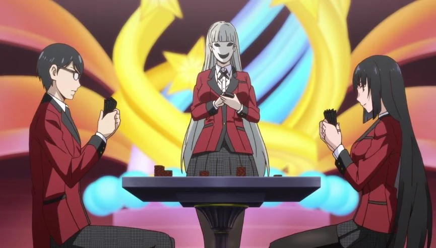 W trzecim rozdaniu Yumeko stawia dwadzieścia żetonów, a Kaede podnosi swoją dwudziestkę. Podnoszą się nawzajem, aż Yumeko wchodzi ponownie za wszystko. Kaede podnosi wtedy swoje sto żetonów. Bez innej opcji, Yumeko wzywa Itsuki podnieść zakład z jej życia, a Itsuki zobowiązuje widząc rękę Yumeko jak ona gryzie jej paznokcie dowodząc, że jest poważny. Kaede odrzuca mówiąc, że nie ma wartości pieniężnej w osobie, ale Yumeko odrzuca mówiąc, że to nie jest jej wybór, ale wybór krupiera. Ririka akceptuje zakład twierdząc, że życie Itsuki jest warte dziesięć miliardów jenów, ale Kaede nadal stoi przeciwko, jednakże, kiedy Ririka zdejmuje maskę, ujawniając się w rzeczywistości jest przewodniczącą Samorządu Uczniowskiego, Kirari Momobami, i pozostawiając wszystkich w szoku.