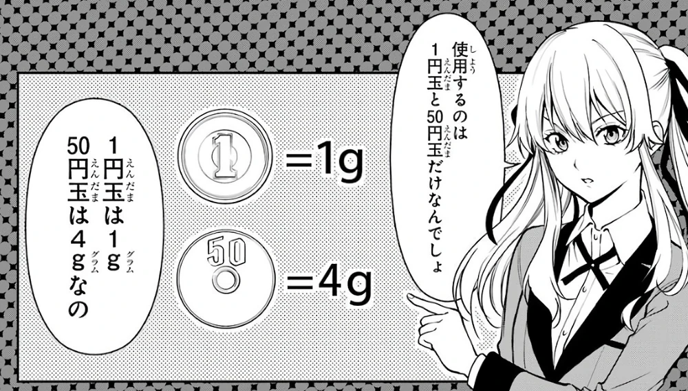 Do dyspozycji jest w sumie 600 drobnych monet: 300 monet 1 jenowych i 300 monet 50 jenowych. Moneta 1 jenowa waży 1g, a 50 jenowa 4g. Każdy z graczy otrzymuje również "pudełko oszczędności". Do swojego pudełka może wrzucić tyle monet, ile chce. Następnie obaj gracze kładą pudełka na wadze i muszą odgadnąć, ile monet każdej wagi znajduje się w pudełku drugiego gracza. Każdy z graczy zna wagę swojego pudełka i może spróbować określić ją na podstawie różnicy.